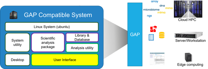 GAP平台開發的方法、流程、判讀流程,又可以任何相容平台上重現。透過數據及分析方法的標準化,GAP平台促使生物資訊的研發成果迅速在開發單位與產業應用端流動,加速研發到商品的進程。