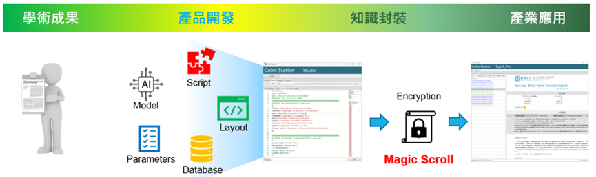 魔法卷軸封裝技術(Magic Scroll, MS)是一種軟體封裝技術,將GAP上支程式流程、判斷邏輯、基因註解及報告格式等,封裝在單一檔案中,便於在不同分析設備上重建。在實驗室發展出的應用分析流程,可以全部封裝成一個檔案(商品),而使用者購買下載後,就可立即在自己的設備中建立出一模一樣的分析流程。
