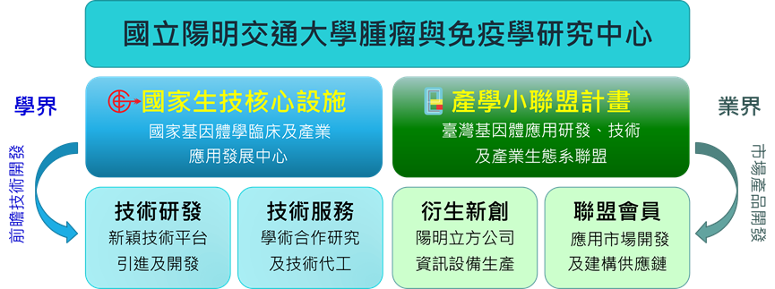 臺灣基因體應用研發、技術及產業生態系聯盟」是國立陽明交通大學腫瘤與免疫學研究中心所營運的產業聯盟,成立的宗旨是透過中心研發的生物資訊及人工智慧的技術,串接國內基因體相關產業鏈,並擴大國內應用市場。本中心的前身是榮陽基因體中心,是全國最早成立也是唯一參加過人類基因體定序計畫的基因體中心,擁有20年基因體相關技術服務及研發的經驗。本聯盟的核心技術也來自中心,中心長期與國內產官學研單位有長期的合作,深刻了解目前國內基因體學發展的機會與困境。我們認為國內基因體學應用的外在環境已經漸趨成熟,但是核心問題是我們對基因體資訊的應用能力有限,以至於無法彰顯基因資訊的價值。如何讓使用者認知基因體序列的無限潛力,創造有感的服務體驗,是整個產業發展的核心問題